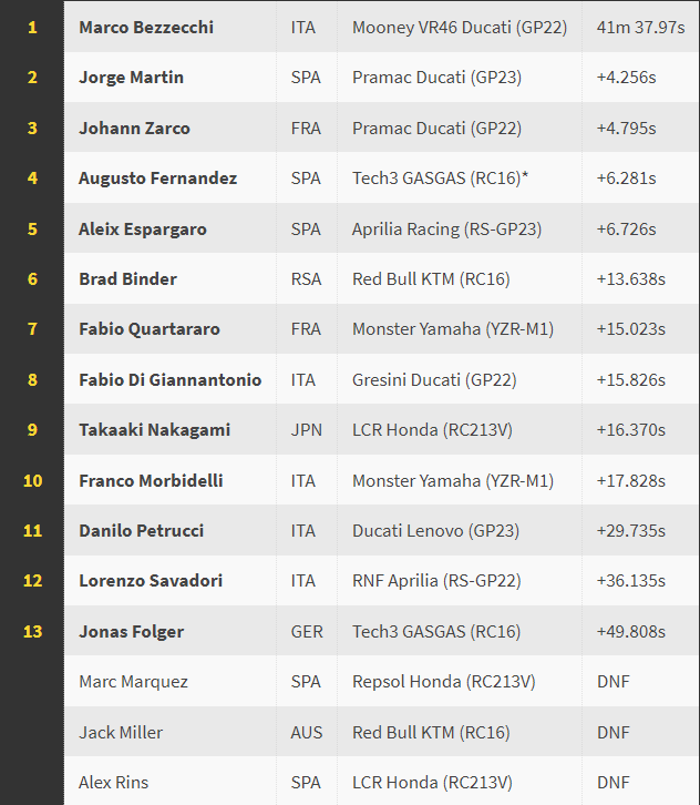 MotoGP–Rins and Mir, series leader Pecco Bagnaia, the three rookies left standing bringing up the rear.