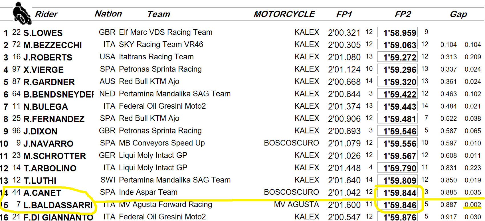 So there is a sandstorm going on in FP3. The results from Friday are going to stand, leaving names like Oliveira, Mir, Nakagami, Rossi, Pol Espargaro and Brad Binder to slug it out in QP1. Ugh. Notice rookie Jorge Martin in P5.
