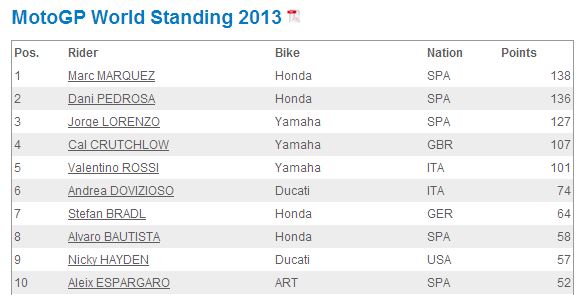 Lest I forget completely, GO&FUN loose cannon Alvaro Bautista finished a respectable 5th today, followed by Crutchlow’s Monster Tech 3 Yamaha teammate Bradley Smith. Of the two, Smith’s finish is more impressive, given the inferiority of his satellite Yamaha to the factory spec Honda under Bautista. Rumor has it that Bautista’s contract with Fausto Gresini for 2014 is being subjected to numerous stress tests, as the volatile Italian team owner seeks some way to eject Alvaro from his team while still on speaking terms with HRC. Bautista is, to my knowledge, the only premier class rider to have applied blonde highlights to his hair, a commentary on where his priorities lie.